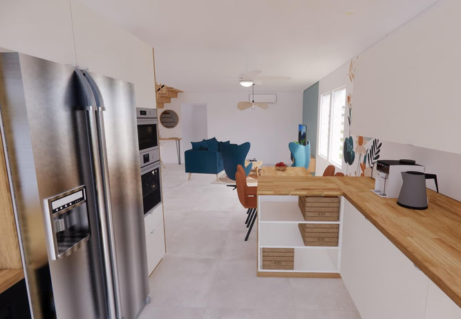 À l’achat de leur maison mitoyenne au Port, cette famille souhaitait être accompagnée pour structurer l’aménagement de la pièce de vie et de la cuisine, avec la possibilité de repenser également la salle de bains.